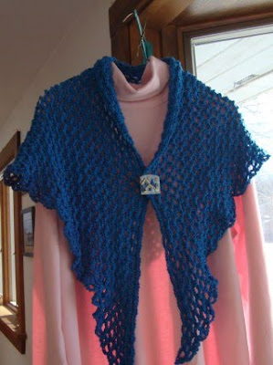 I finished another shawl - not quite sure what I'm going to do with this one. It's knit with some hand dyed yarn I received in a swap - it's from Fat Bottom Girl politically incorrect fibers and yarns and is spun from silk and merino in a fingering weight. It's the "Foulard" scarf from Moorehouse Farms Merino knits. There is also a pattern for a case to put it in so you can carry it with you for those cool days when you just need a little something, or put it on your head on a windy day.